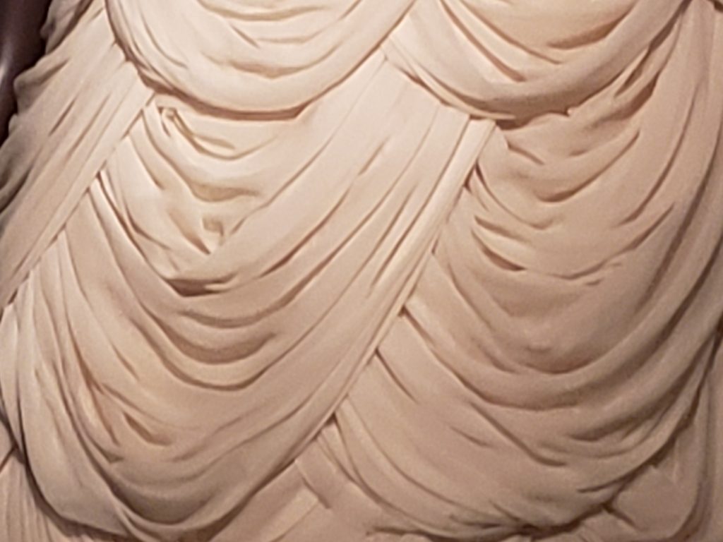 The different displays have a wide variety of garments from several different time periods. The fabrications are a wonder to see. Some of the garments use fabric that is simple, but the way it is draped transforms the garment into something special.