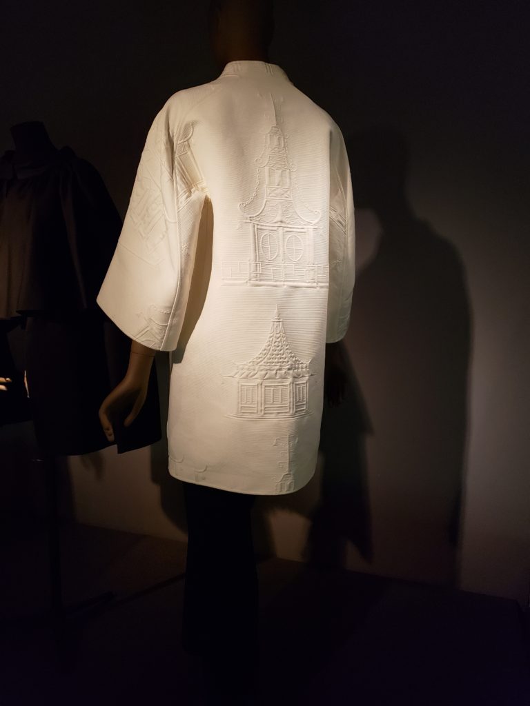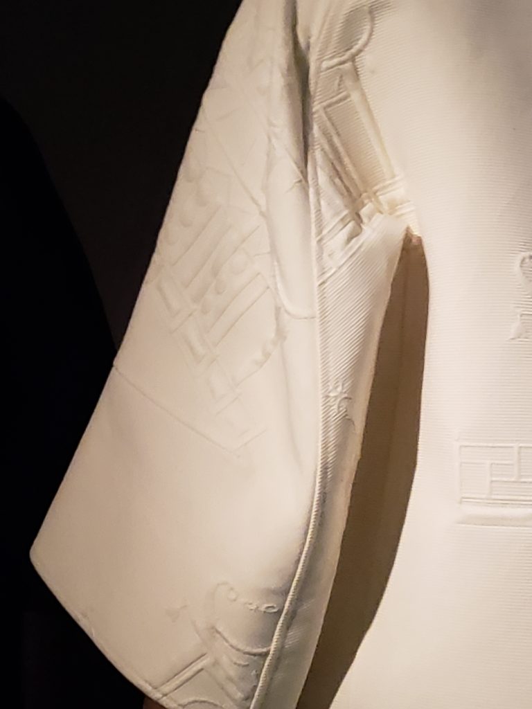 You can see the work along the sleeve, as well as on the back of the jacket in the pictures above. As I read the information card, my jaw dropped. These motifs were actually woven INTO the fabric! Incredible! The knowledge and mastery of weaving required to do this seamlessly is truly a talent. Ralph Rucci (designer) is only the 2nd American to be invited to join the Chambre Syndicale, which is the French regulating commission that decides which which fashion houses are eligible to be labeled as haute couture houses. In France, the designation as haute couture, is protected. You can’t just add that to your label!