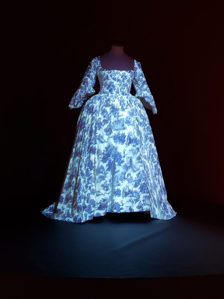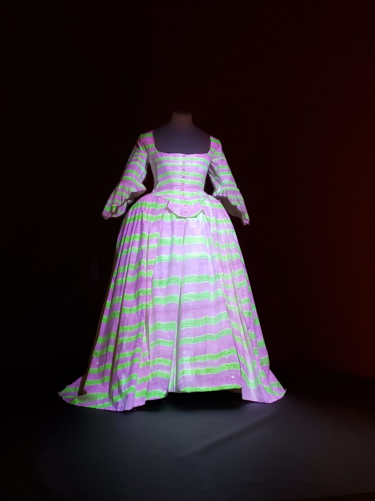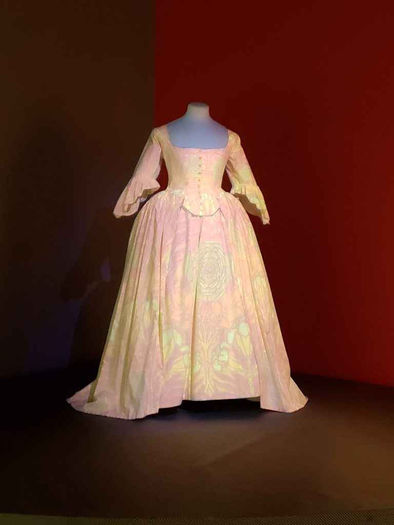 As you enter the exhibit, the first dress is the portrays the Exhibit’s theme – Fabric in Fashion. The dress is a reproduction (not the original). It stands alone, with a light directed at it. Different filters are cycled through, showing how the dress would look if it were made from different fabrics. The patterns run from a William Morris-type to the mod fabrics of the (19)60’s.