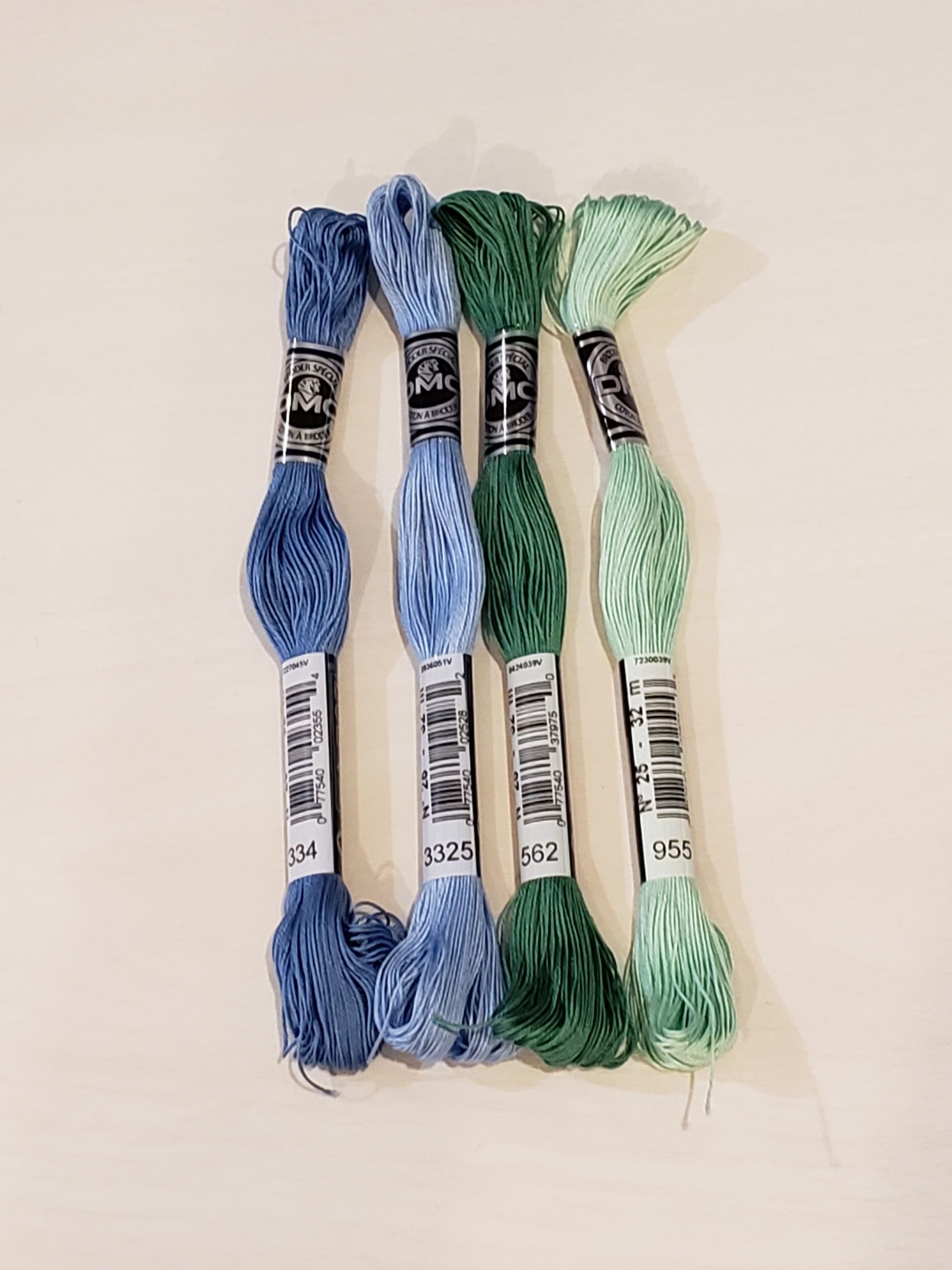 Includes 1 skein of each of the colors of Coton a Broder #25 shown: 334 (dk blue), 3325 (light blue), 563 (med. green, 955 mint.  If you are going to smock with mainly 1 color, you can add another skein HERE