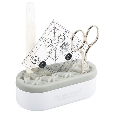 Oh…Sew! Organized Stash n Store Mini – Grey. The new Stash n Store Mini is the perfect small device to keep your sewing and crafting notions within arm’s reach, easily visible and ready to go. Half the size of the original Stash N Store, this is perfect when you have to conserve space! Store marking tools, scissors, stilettos, rulers, pressing tools, even brushes and small rotary cutters, in an easy-to- grab upright position. The Stash n Store’s silicone pockets are smooth, have a sturdy grip, and are simple to clean. Simply pull off the silicone layer, give it a rinse, and pop it back in place. Also, the beautiful pocket design offers a small and large space for a great fit for any notion.